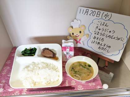 今日の給食は、ごはん、牛乳、なまりぶしのしょうが煮、みそ汁、ほうれんそうのおひたしです。