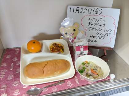 おさつパン、牛乳、豚肉とキャベツのスープ煮、変わりピザ、みかんです。