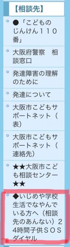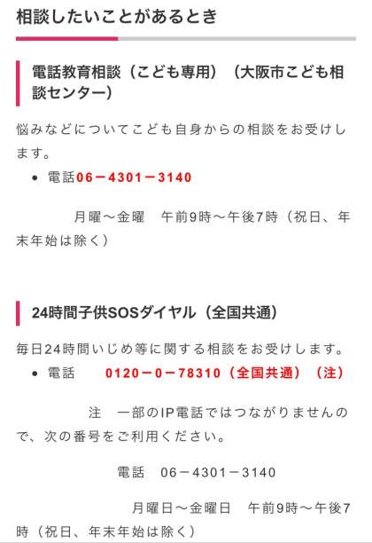 大阪市こども相談センターの「電話教育相談」と、「24時間子供SOSダイヤル」について、学校ホームページ右らん【相談先】に案内しています。