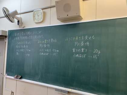 「ふりこ」の実験をしました。往復にかかる時間のきまりを見つけようというめあてで進めました。