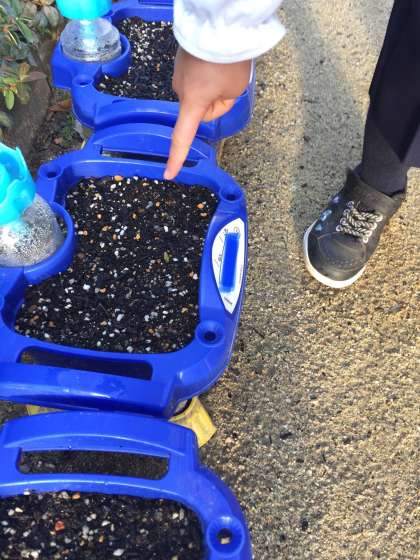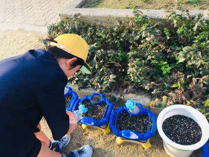 登校後すぐに、チューリップの水やりをしている児童がいました。めが出るのを楽しみにしています。チューリップのめが出て、嬉しそうにしている児童もいました。