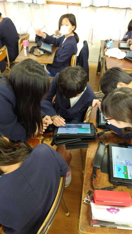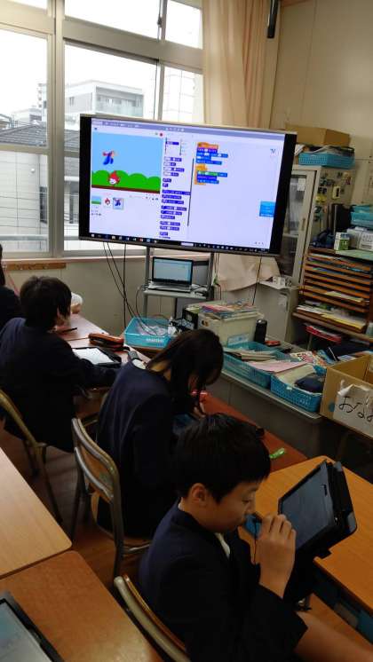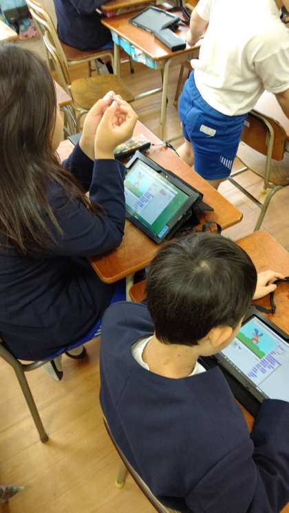 六年生でプログラミングの学習をしました。スクラッチというソフトを使い、友だちとも相談しながら取り組みました。
