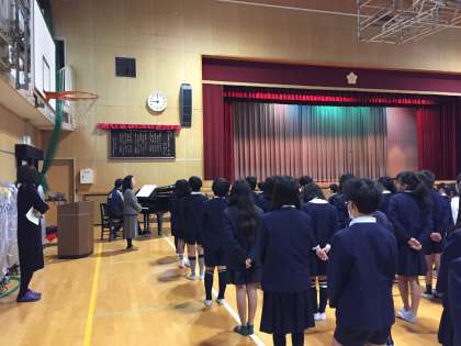 式の開式のことばの後に大阪市歌を斉唱し、閉式のことばの前に校歌を斉唱しました。3年2組と2年2組の代表児童が、3学期にがんばることを発表した後、校長先生からのお話を聴きました。