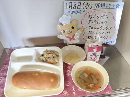 今日の給食は、おさつパン、牛乳、マカロニグラタン、だいこんのスープ、和なし(缶)です。
