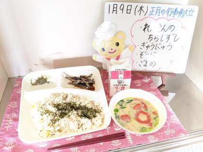 今日の給食は、れんこんのちらしずし、牛乳、ぞう煮、ごまめ(田づくり)です。