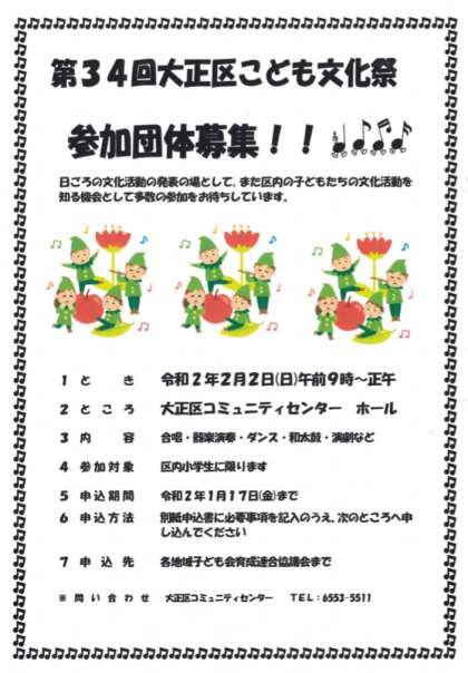 2月2日(日)に行われる「大正区こども文化祭」に本校の舞台クラブと音楽クラブが参加します。まだ参加確認書を提出されていない方は、火曜日にご提出をお願いします。