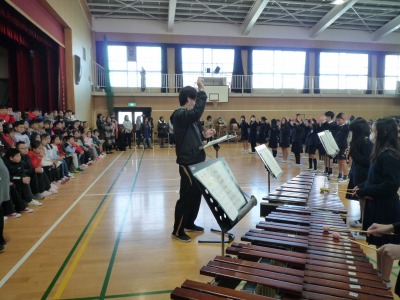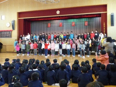 今日は、中国天津市中営小学校5年生との交流会を行いました。1時間目は、全校児童集会を行いました。三軒家東小学校の児童は「パプリカ」の合唱と演奏をしました。その後、中国天津市中営小学校の5年生の合唱を聞きました。