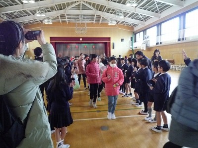 中国天津市中営小学校との交流会を行いました。最後には、「再見」とあいさつをしながら見送りました。