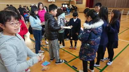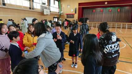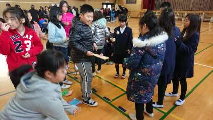 5年生同士が交流をしました。 日本の昔遊びを一緒にしました。「羽子板」や「けん玉」をしている様子です。