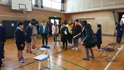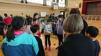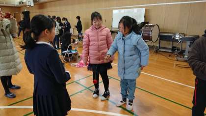 5年生同士が交流をしました。日本の昔遊びを一緒にしました。「けん玉」や「羽子板」を一緒にしている様子です。