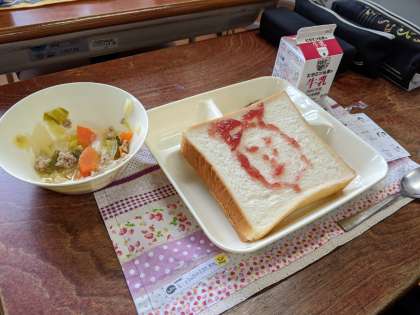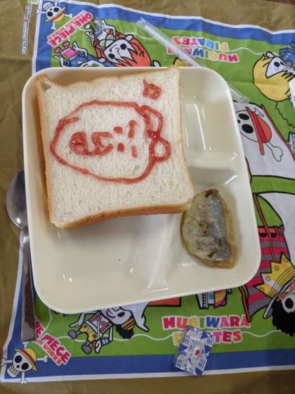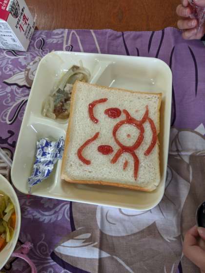 5年生の教室では、食パンにいちごジャムでイラストを描きながら、楽しくおいしく食事をしていました。
