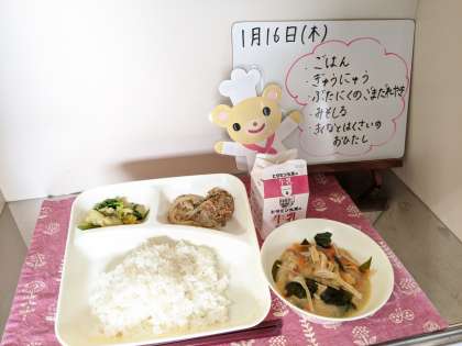 今日の給食は、ごはん、牛乳、豚肉のごまだれ焼き、みそ汁、きくなとはくさいのおひたしです。