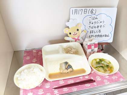 今日の給食は、ごはん、牛乳、さばのみそ煮、すまし汁、もやしのゆずの香あえです。