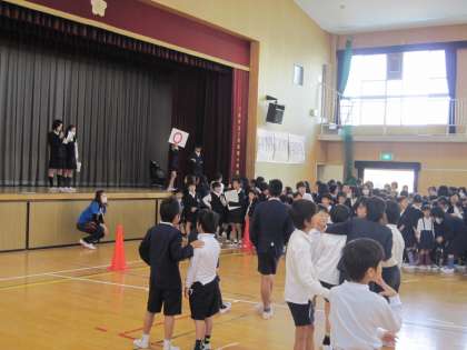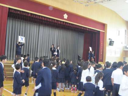 今日の集会は「○×クイズ」でした。○だと思った人は○のところに、×だと思った人は×のところに並びます。「運動場にあるタイヤは13個である、○か×か?」という問題は思いの外正解が少なかったです。いつも見ているのに、案外分からないものですね…。ペアのお友達と相談して○か×かを考えて並びました。何問正解したか、お家で聞いてあげてください!