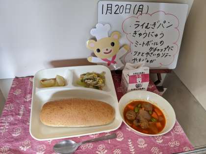 今日の給食は、ライ麦パン、牛乳、ミートボールのケチャップ煮、ツナと野菜のソテー、焼きじゃがです。
