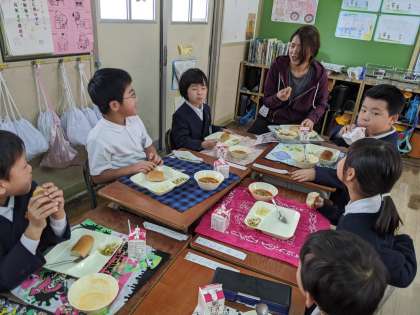 給食週間の取り組みで、1年1組は給食調理員さんと一緒に給食を食べました。「いつもおいしい給食ありがとうございます!」「今日のミートボールおいしいよ!」など、普段なかなかお話できない給食調理員さんたちへ感謝の気持ちを伝えていました。