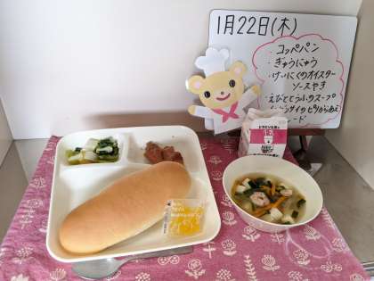 今日の給食は、コッペパン、マーマレード、牛乳、鶏肉のオイスターソース焼き、えびととうふのスープ、チンゲンサイのピリ辛あえです。