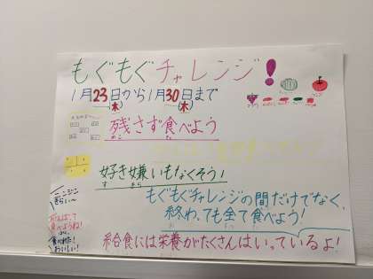 今日から30日までは、もぐもぐチャレンジをしています。クラスで協力して、無理のない範囲で食べ残しゼロを目指しています。結果は、またホームページに掲載いたします。