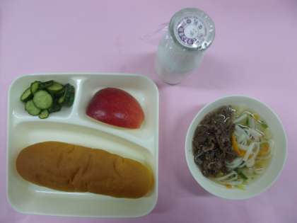 今日の献立は「肉うどん、きゅうりの甘酢づけ、りんご」でした。
