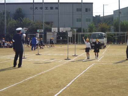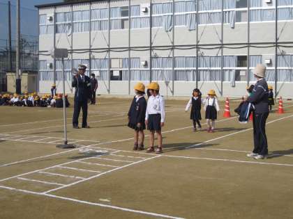 今日は、大正警察の方々にお越しいただき、早朝より準備もしていただいて、交通安全指導を実施しました。2時間目は1,2年生が道路の歩き方について学習しました。