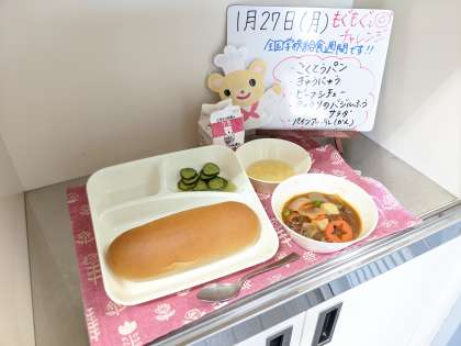 黒糖パン、牛乳、ビーフシチュー、きゅうりのバジル風味サラダ、パインアップル(缶)です。