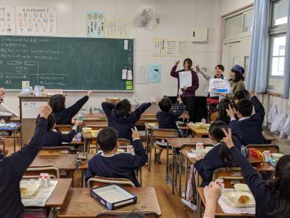 今日は3年2組の教室に給食調理員さんが来てくださいました。給食の歴史クイズを一緒にして、給食についての質問をしていました。今日の給食は野菜をどれくらい使っていますか?という質問の答えに児童は驚いていました。