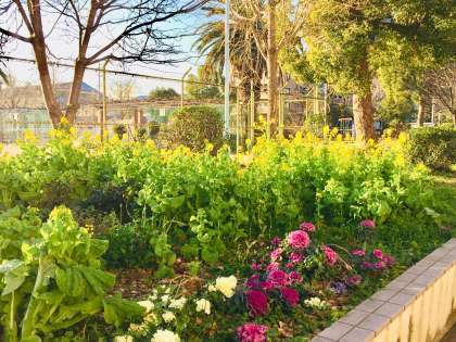 三軒家東公園の花壇に、「なのはな」などのきれいな花が咲いている。三軒家東地域の方々が育ててくださっています。