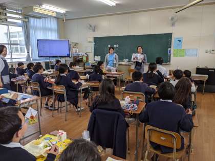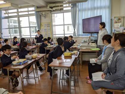 今日は5年1組の教室に給食調理員さんが来てくださいました。給食の歴史クイズを一緒にして、給食についての質問をしていました。