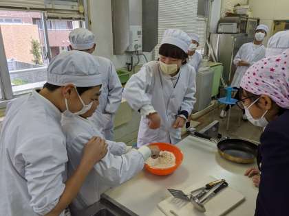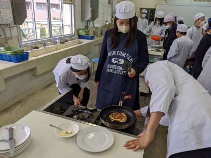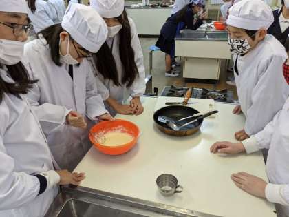 6年生は、調理実習でホットケーキを作りました。班で協力して、おいしいホットケーキができました。