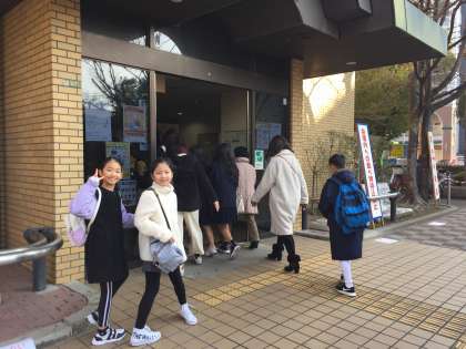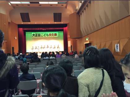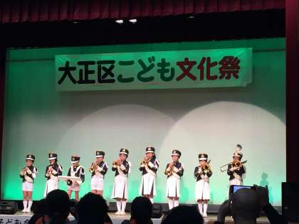 会場で、他のグループの発表を聴いています。プログラム1番の大正区鼓笛バンド ザ・グリーン アップルで活躍している本校児童がいます。