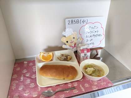 今日の給食は、おさつパン、牛乳、押麦のグラタン、スープ、いよかんです。
