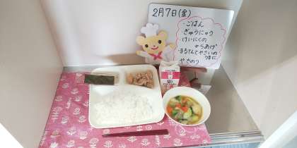 今日の給食は、ごはん、牛乳、鶏肉のからあげ、まる天と野菜のうま煮、焼きのりです。
