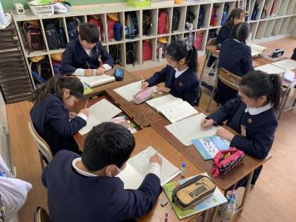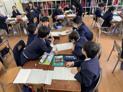 みんなの生活」の学習の様子です。グループでポスター作成に向けて話し合いをしています。今日はアンケートを実施するため、質問内容を決めています。最後にどんなポスターができるのか楽しみです。