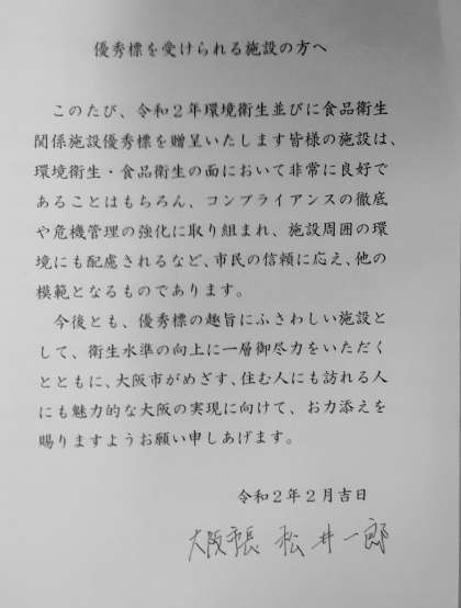 大阪市長から、優秀標をいただきました。