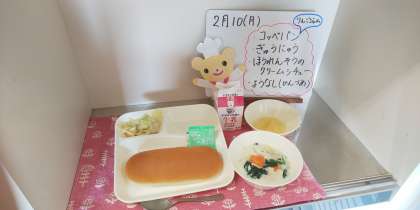 今日の給食は、コッペパン(りんごジャム)、牛乳、ほうれんそうのクリームシチュー、キャベツのサラダ、洋なし(缶詰)です。
