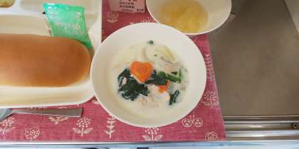 今日のほうれんそうのクリームシチューには、ラッキーにんじんが入っています。通常のいちょう切りのにんじんの中に、ハートの型でくり抜いたにんじんがが入っています。