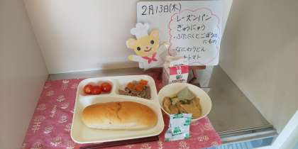 今日の給食は、レーズンパン、牛乳、豚肉とごぼうの煮もの、なにわうどん、プチトマトです。