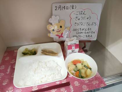 今日の給食は、ご飯、牛乳、きびなごてんぷら、一口がんもとじゃがいもの煮もの、ブロッコリーのごまあえです。