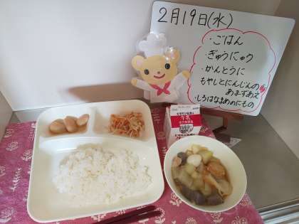 今日の給食は、ご飯、牛乳、関東煮、もやしとにんじんの甘酢あえ、白花豆の煮ものです。