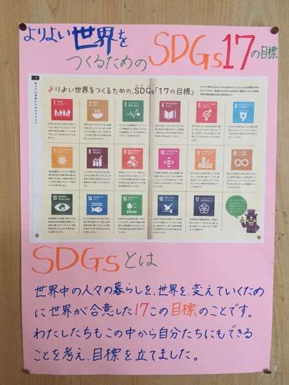 講堂に掲示しています。17のゴールの中から、子どもたちが自分でできることを目標にして、ポスターにしました。