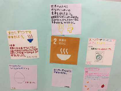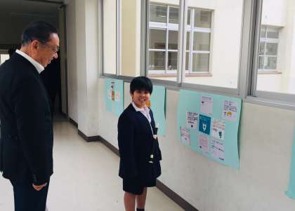 学校協議会を行いました。廊下に掲示している子どもたちのSDGsの取り組みを見ていただきました。