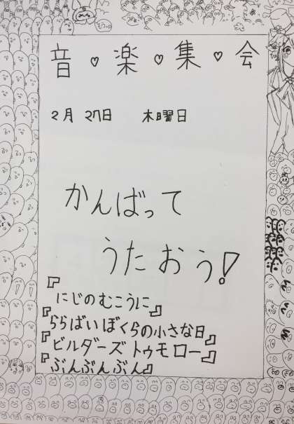 1.2年生は、歌いました。練習を一生懸命に取り組んでいたので、自信をもって歌えました。3.4年生はリコーダーの音のハーモニーが良かったです。6年生は最上級生らしく堂々と演奏していました。