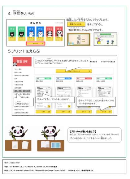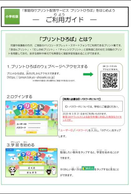 この度、大阪市教育委員会より子どもたちが授業を十分に受けることができないことによって、学習に著しく遅れが生じることがないよう、家庭向けプリント配信サービス「問題データベースプリントひろば」の利用案内がありました。 つきましては、担任より配付しております課題に加えて、必要なご家庭は添付しております「ご利用ガイド」を参考にご活用ください。なお、利用にはユーザーIDとパスワードが必要です。