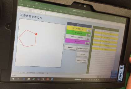 習熟度別授業で算数を担当している先生が、来年度から実施するプログラミング学習をされています。プログラミングで正五角形をかきました。今年度は、なかよし学級の5年生に少し紹介しました。