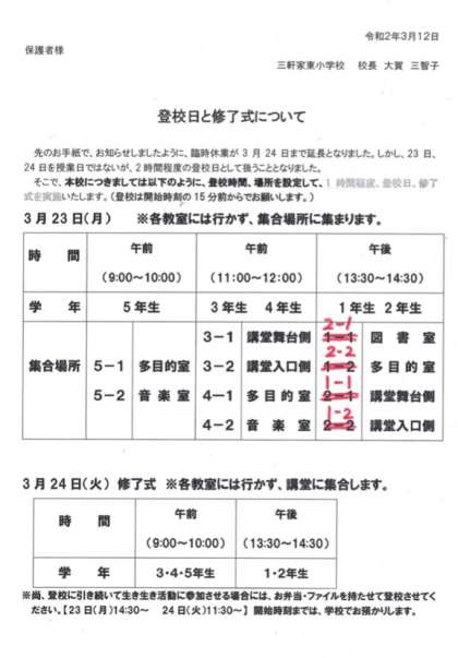 【変更】登校日と終了式について