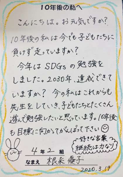 スポーツで頑張ってきたこと、家族とどんな生活をしているかなど、10年後の自分を想像して、手紙を書きましょう。他にも、四年生で学習したSDGsの目標に向かってどんな取り組みをしているのかなど10年後の自分に伝えたいことなどを書きましょう。