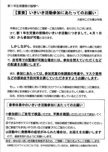 【新1年生 保護者の方へ】いきいき活動参加にあたってのお願い