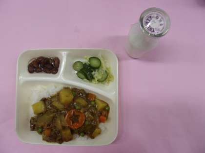 今日の献立は「ビーフカレーライス、グリーンサラダ、うずら豆のグラッセ」でした。