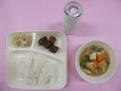 今日の献立は「くじらのたつたあげ、豚肉とさといものみそ煮、もやしのゆずの香あえ」でした。