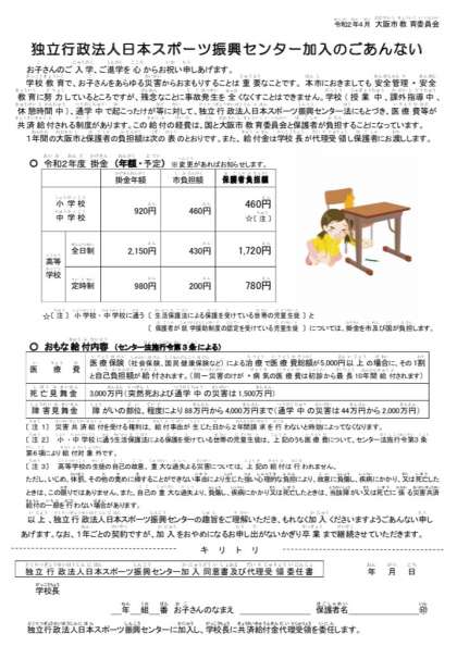 教科書給与で来校されるときに、「日本スポーツ振興センター加入同意書および代理受領委任書」のご提出をお願いします。加入をおやめになる申し出がないかぎり卒業まで継続させていただきます。PDF版は、こちらです。→